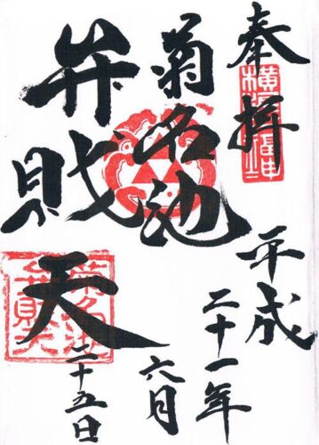 菊名池弁財天 住所:港北区菊名1丁目8−1 菊名池公園 一言:横浜七福神の弁財天。普段は無人の祠である。御朱印は横浜市港北区篠原東3丁目1−4のみどりや陶器店で頂く事ができるが、事前に電話で確認する必要がある。みどりや陶器店 045-421-5949
